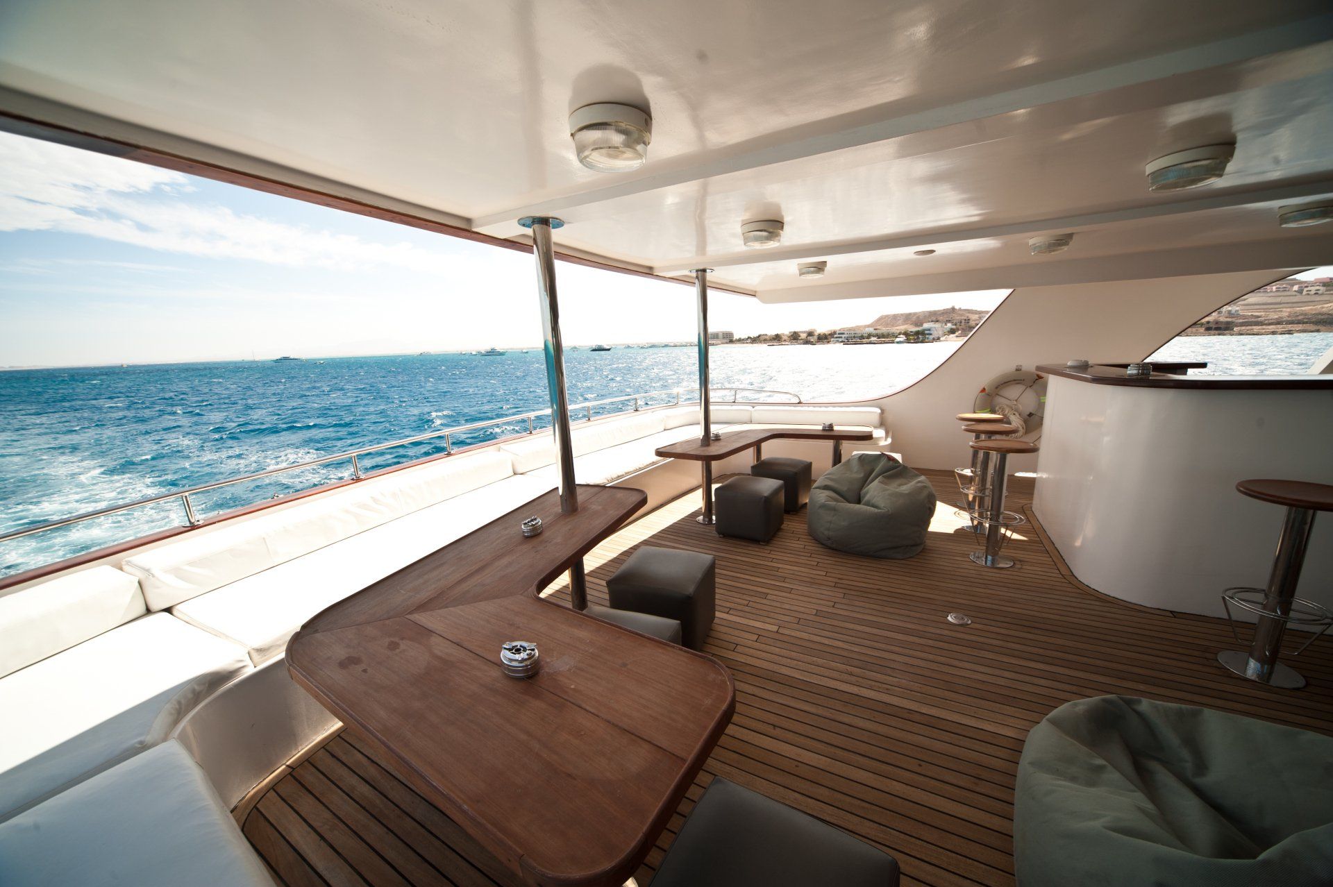 | Schattendeck (1. Oberdeck) mit großem, komfortablem Sitzbereich sowie Bar | Tauchdeck sowie Tauchplattform mit 1 Dusche und 1 Toilette | 22 x ENOS-Sender sowie 1 x Empfangsstation (Satelliten gestütztes Taucher Notruf- und Ortungssystem) |